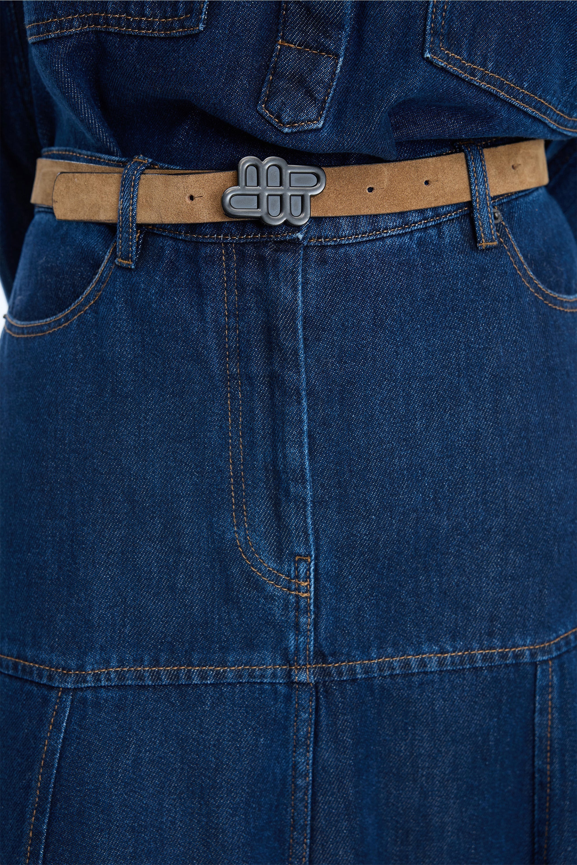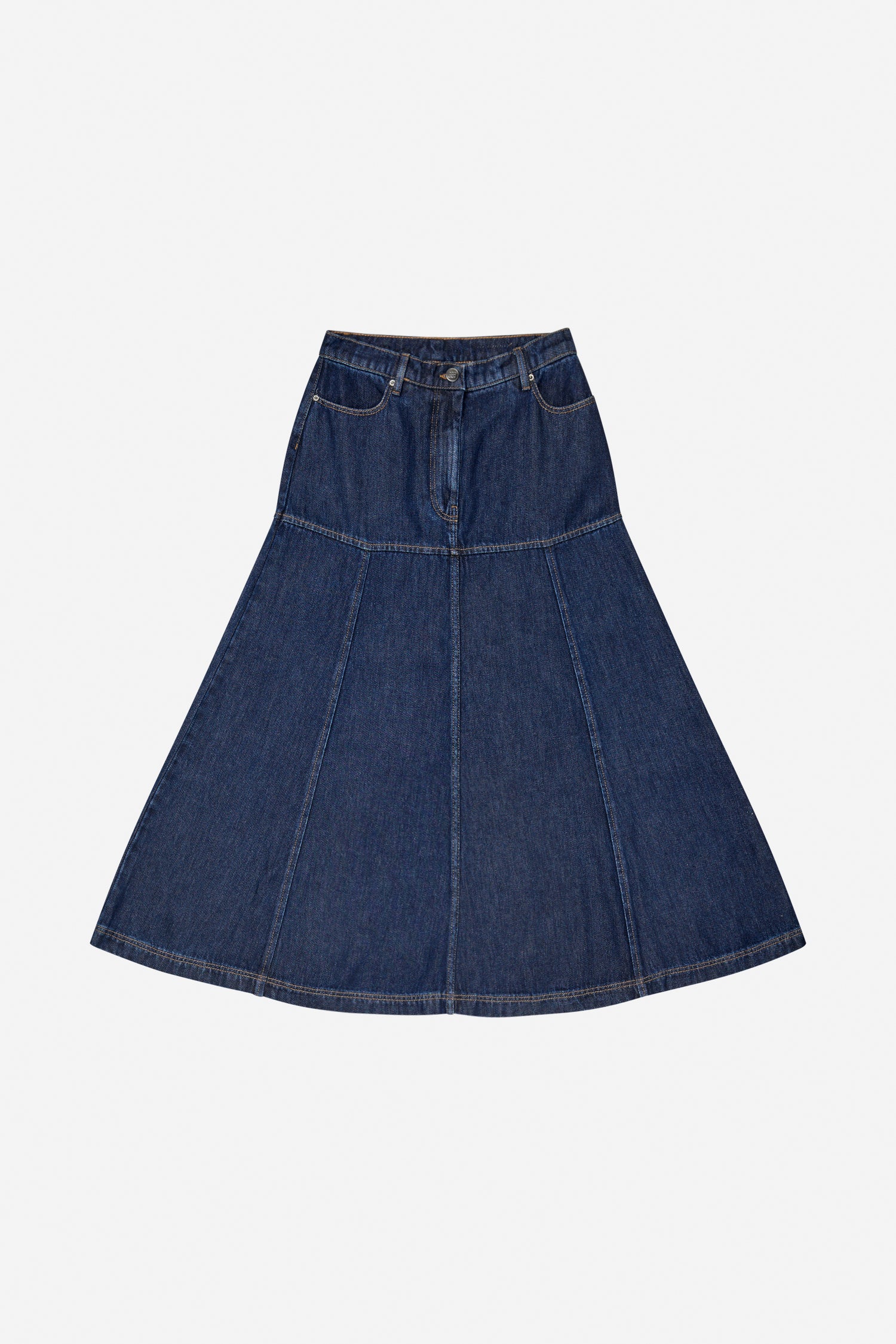 Een prachtige denim rok met een strakke pasvorm rond de heupen en een contrasterend flair effect vanaf de heupen en naar beneden. De rok heeft riemlussen, zakken en een normale pasvorm.